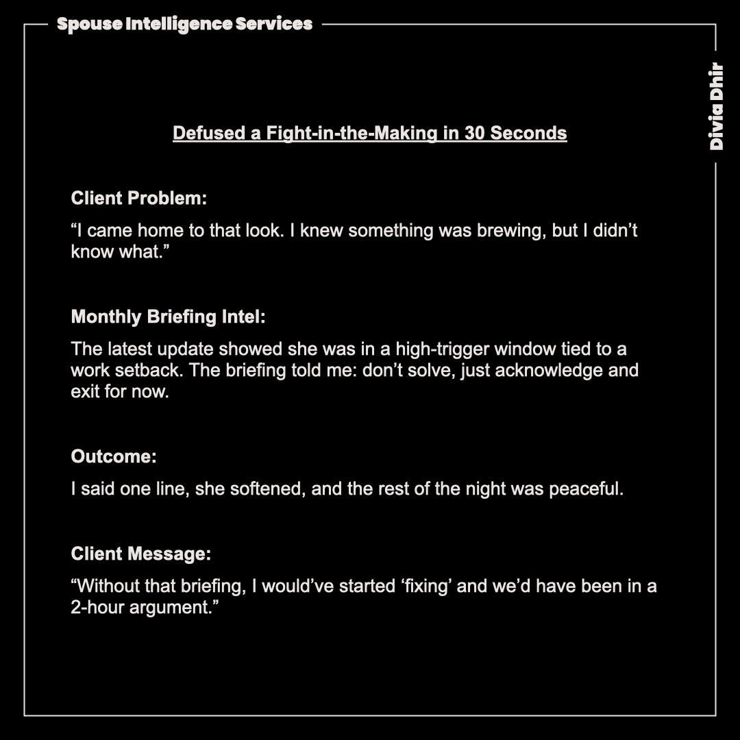 Disclaimer:To protect client confidentiality, certain identifying details (such as names, industries, and deal specifics) have been modified.The strategies, insights, and results described are drawn from real client engagements and accurately reflect the outcomes achieved through the Spouse Intelligence Audit, Monthly Intelligence Briefings, and Operator’s Call.